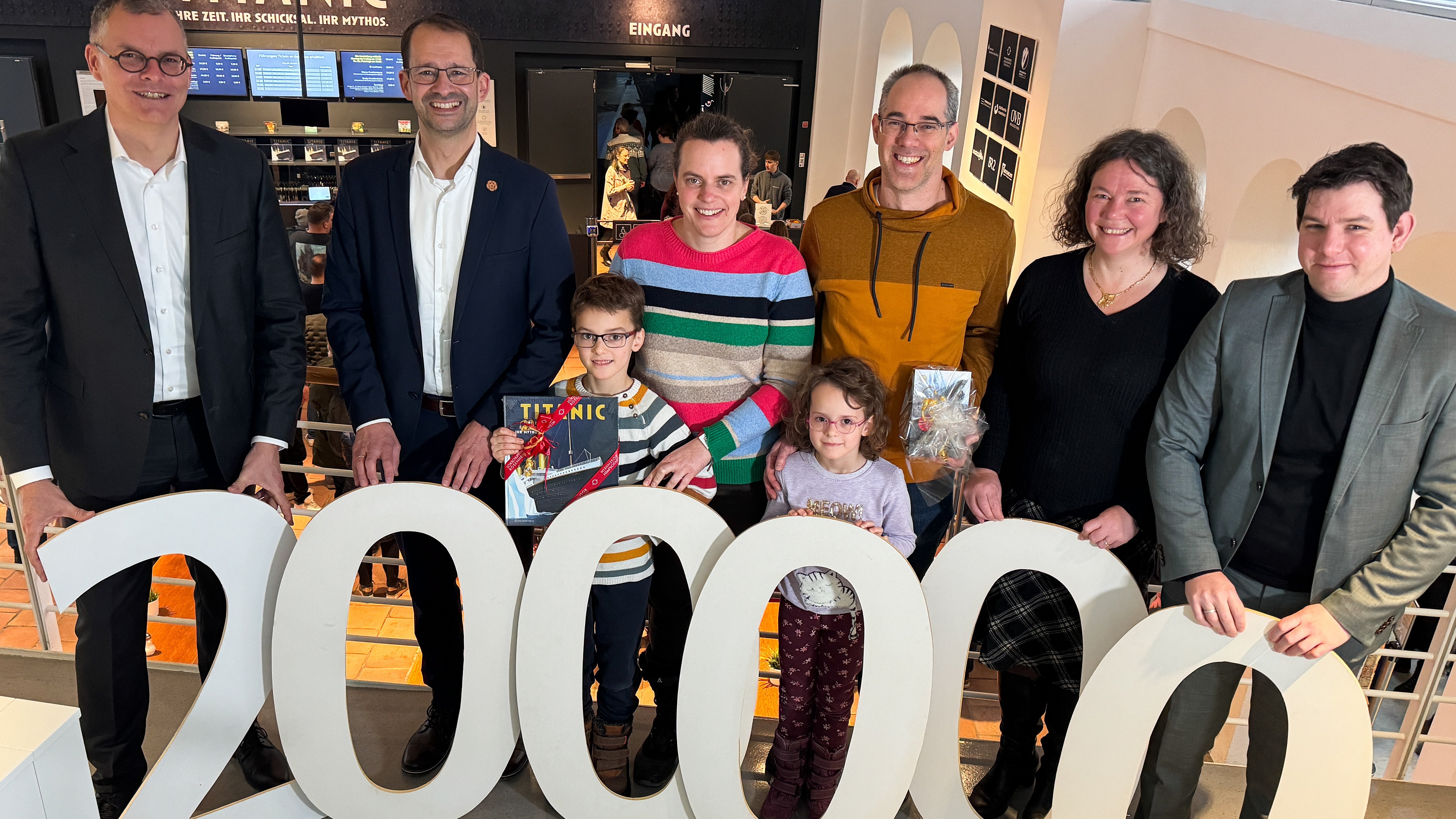 Jubiläumsbesucher-Familie mit großen Zahlen „100.000“ in der Titanic-Ausstellung im Lokschuppen Rosenheim.