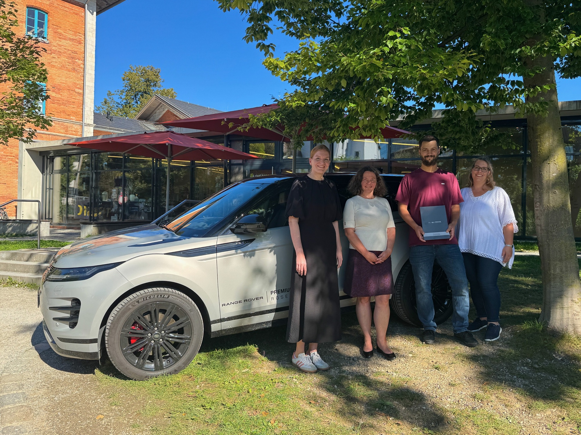 Vier Personen stehen vor einem grauen Range Rover Evoque, Preisübergabe des OVB-Preisrätsels zur Titanic-Ausstellung.