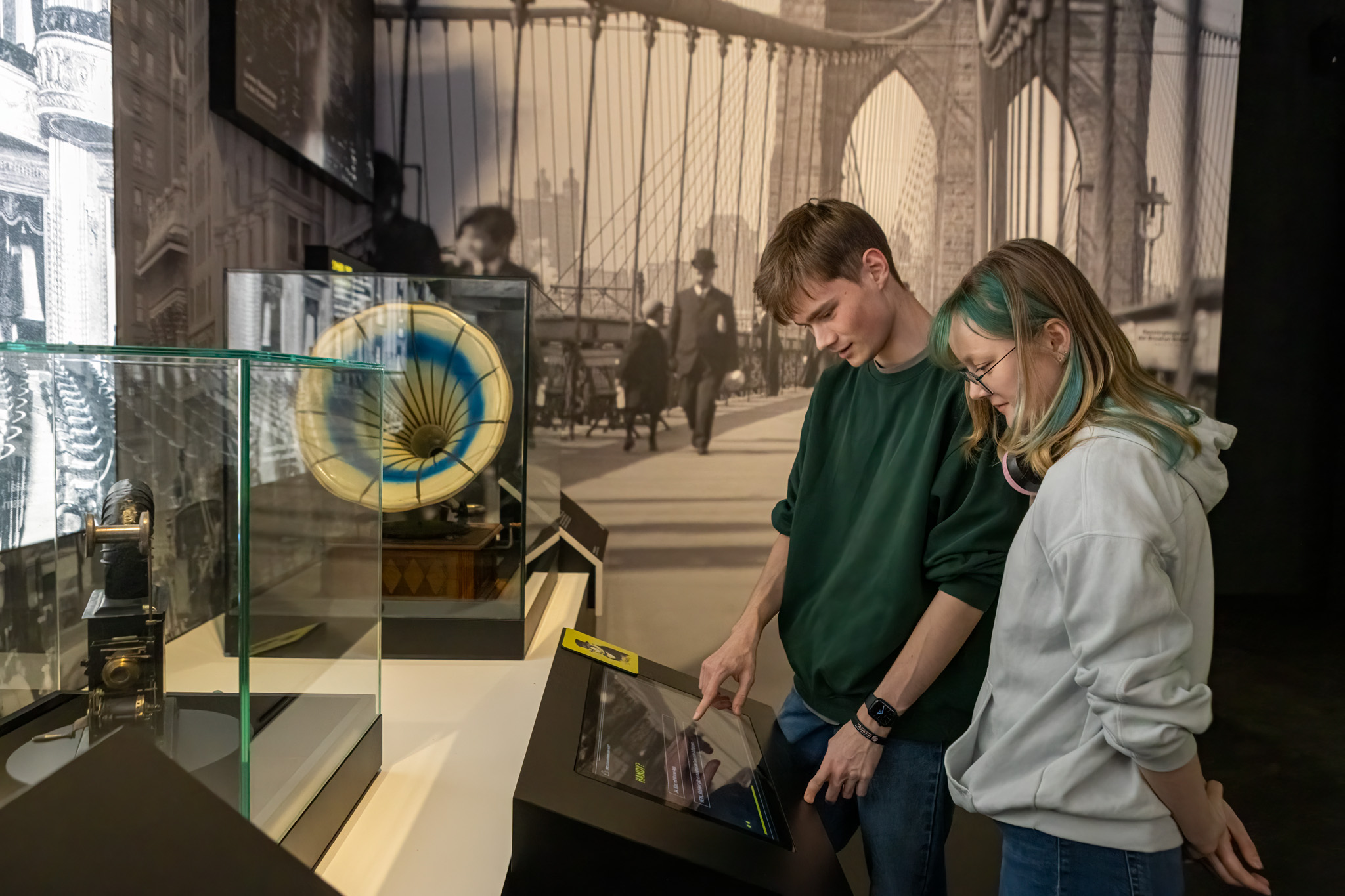 Zwei Personen nehmen an einem interaktiven Erfindungsquiz in der Titanic-Ausstellung teil.