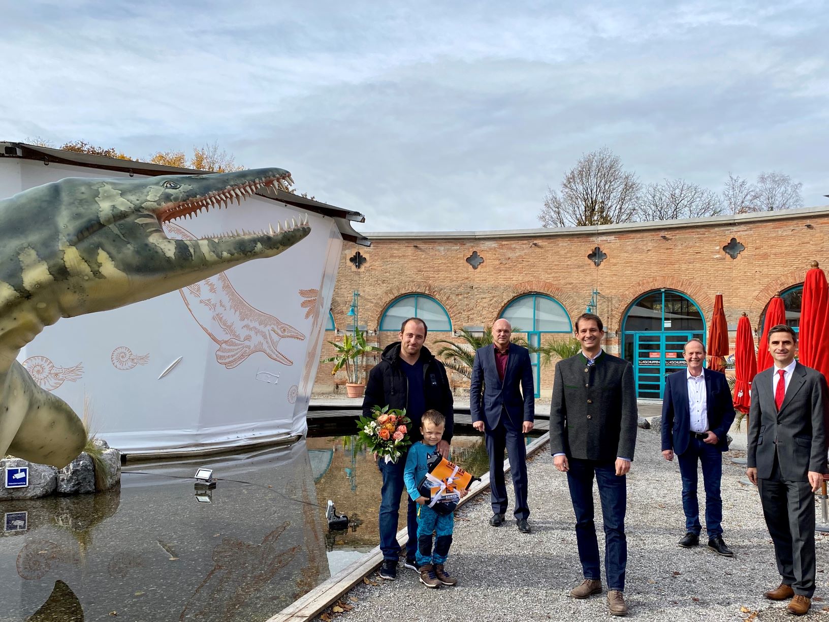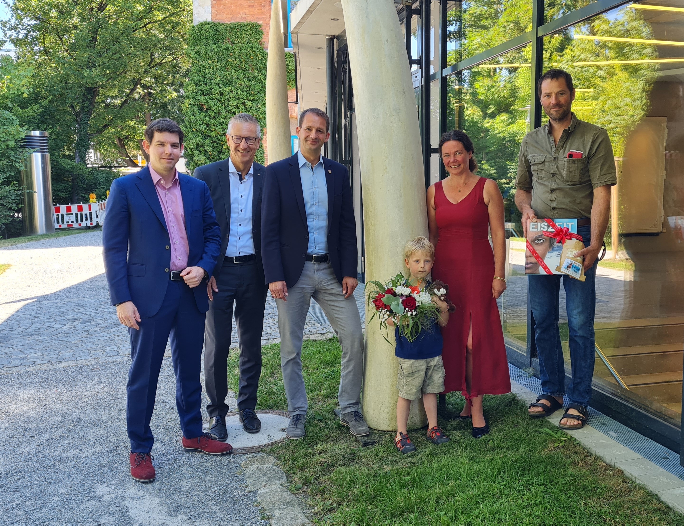 Foto von links: Geschäftsführer der Veranstaltungs+Kongress GmbH Florian Englert, Rosenheims Oberbürgermeister Andreas März, Veronika Krapf mit ihren Söhnen Lukas und Florian, Vorstandsmitglied der Sparkasse Rosenheim-Bad Aibling Stephan Donderer.