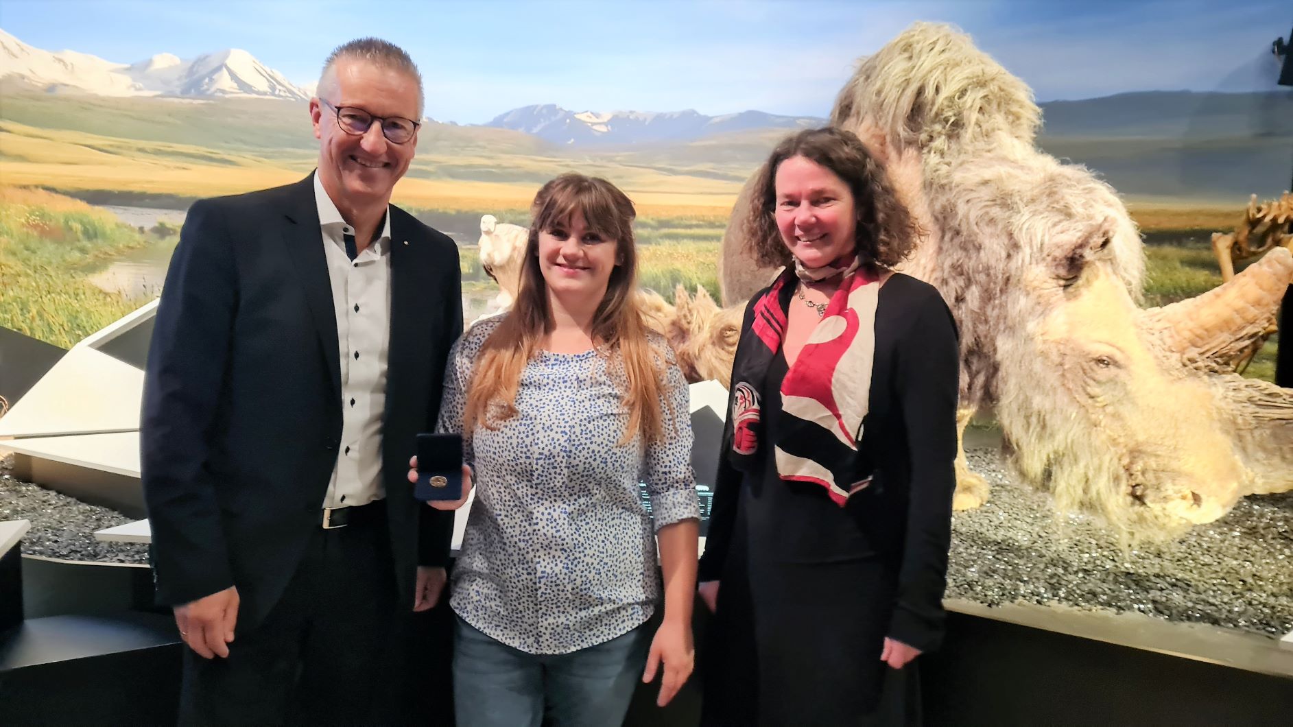 Rosenheims Oberbürgermeister Andreas März und Geschäftsführer der  Veranstaltungs- und Kongress GmbH Rosenheim Florian Englert begrüßen Cornelia  Hartinger, Vorständin der Hartinger Heimatstiftung im Ausstellungszentrum  Lokschuppen Rosenheim.
