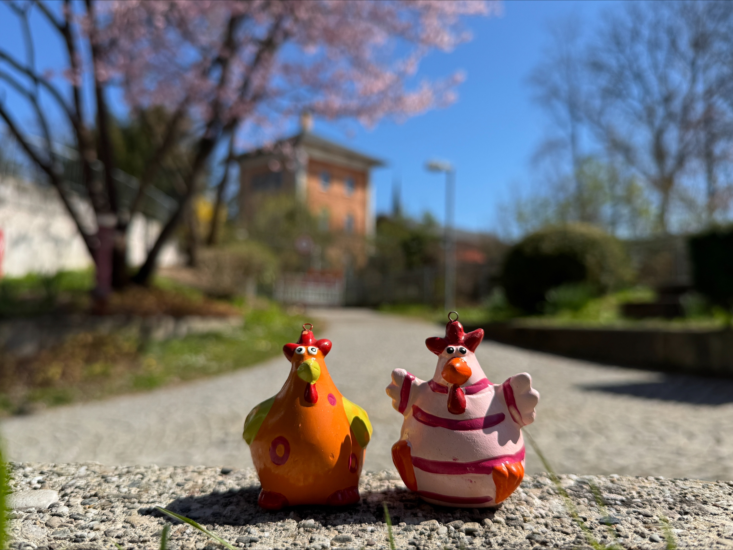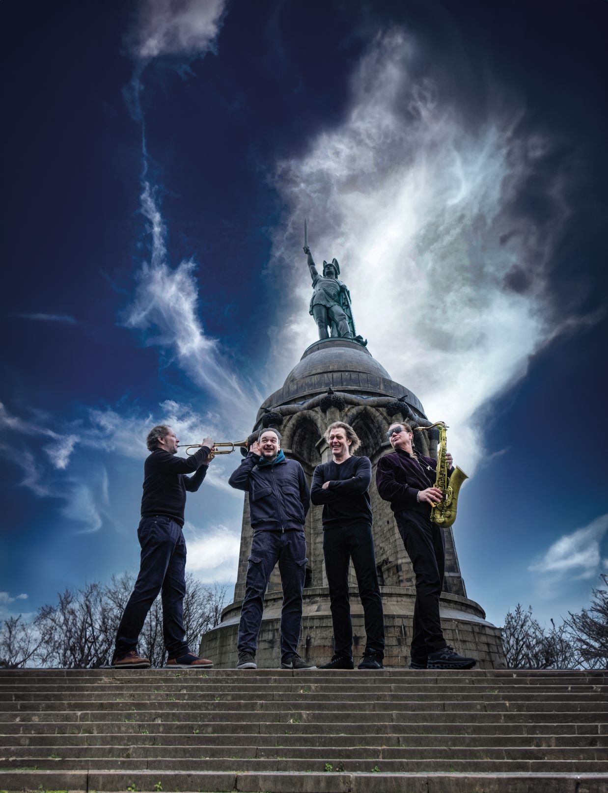Saxophonist Mulo Francel von Quadro Nuevo posiert neben einer lebensgroßen Ladybug-Figur im Innenhof des Lokschuppens Rosenheim.