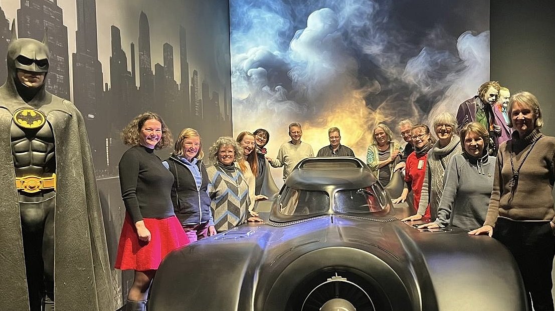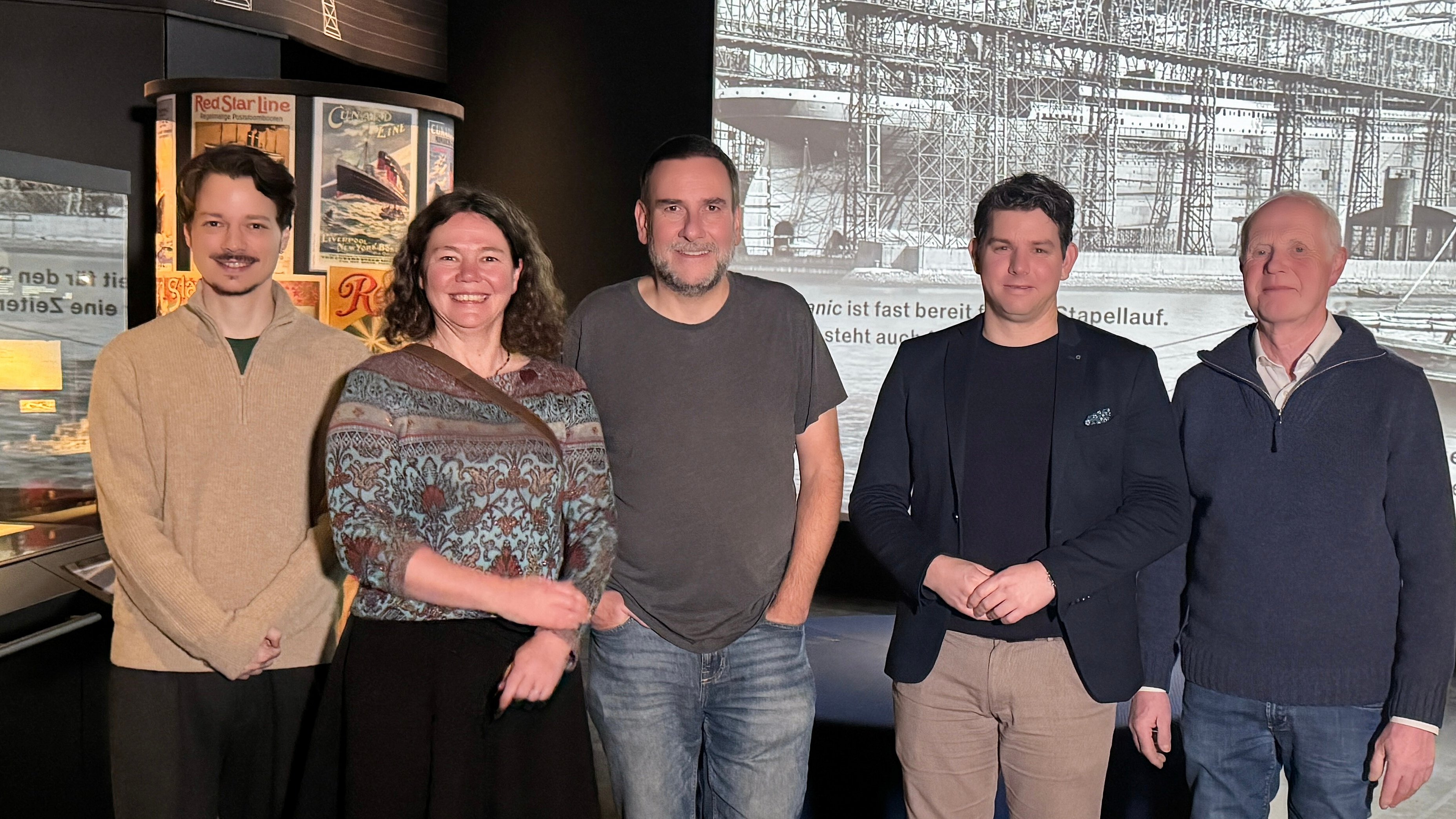 Fünf Personen stehen gemeinsam vor einem Titanic-Ausstellungsplakat und halten Blumen und Geschenke.